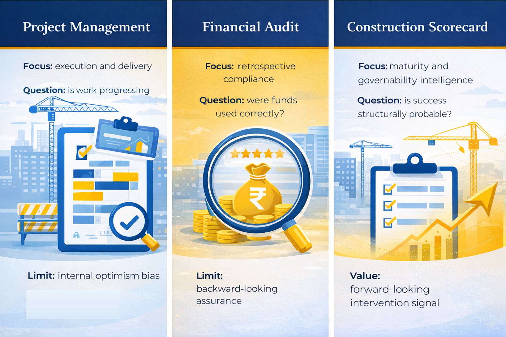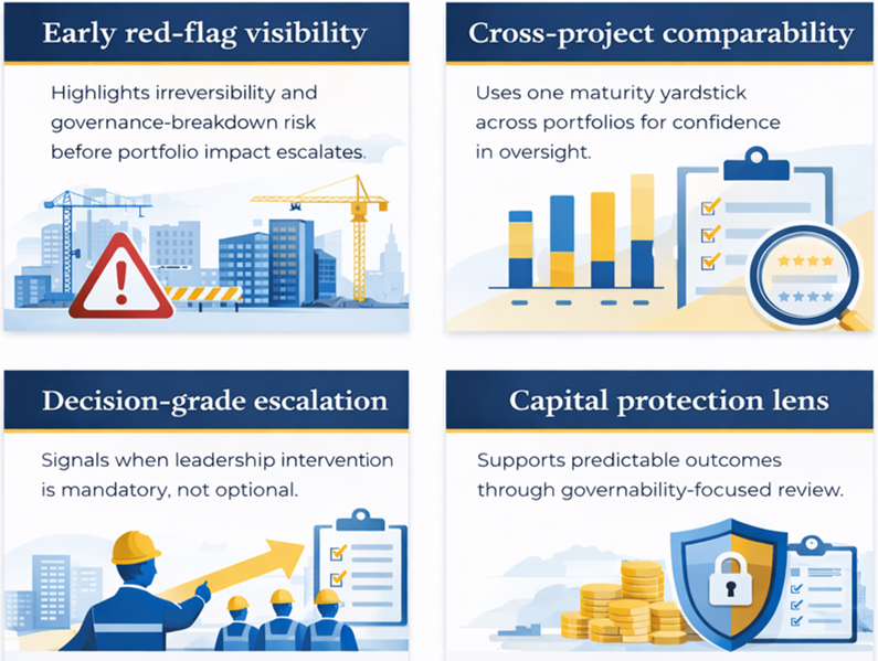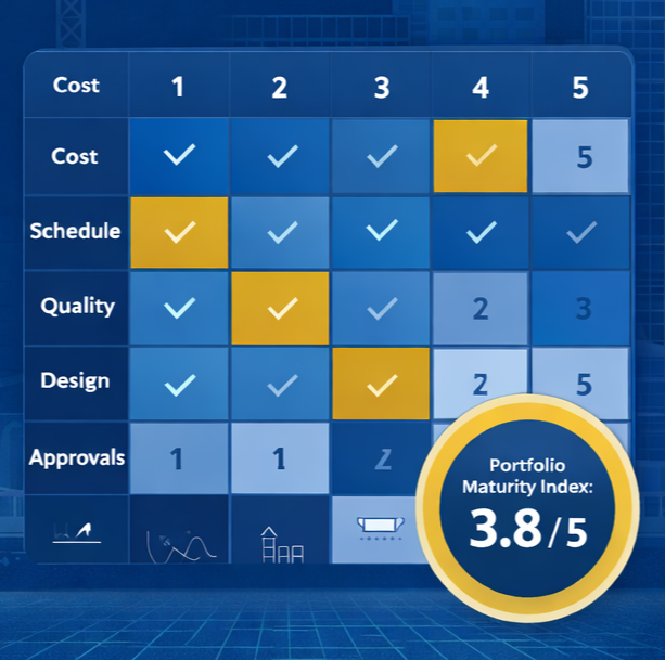 Industry-grade assessment system that measures stage-wise construction maturity, enabling leadership and Boards to identify governance gaps early and trigger timely intervention.